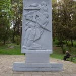 8. Spomenik sa uklesanim likovima tri borca dimenzija 4 X 2 m,