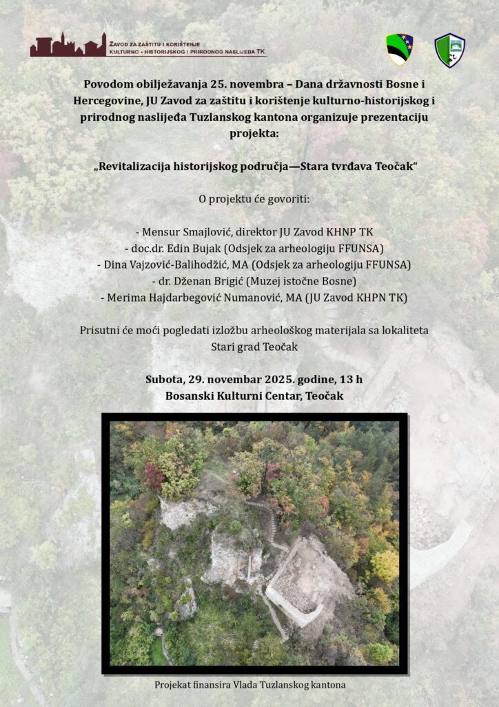 U povodu obilježavanja 25. novembra – Dana državnosti Bosne i Hercegovine, JU Zavod za zaštitu i korištenje kulturno-historijskog i prirodnog naslijeđa Tuzlanskog kantona organizuje prezentaciju projekta: “Revitalizacija historijskog područja-Stara tvrđava Teočak”.